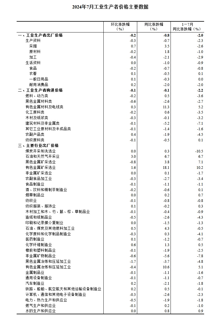 2024年7月份,全国工业生产者出厂价格同比下降0.8%,环比下降0.2%,降幅均与上月相同;工业生产者购进价格同比、环比均下降0.1%。1—7月平均,工业生产者出厂价格比上年同期下降2.0%,工业生产者购进价格下降2.2%。