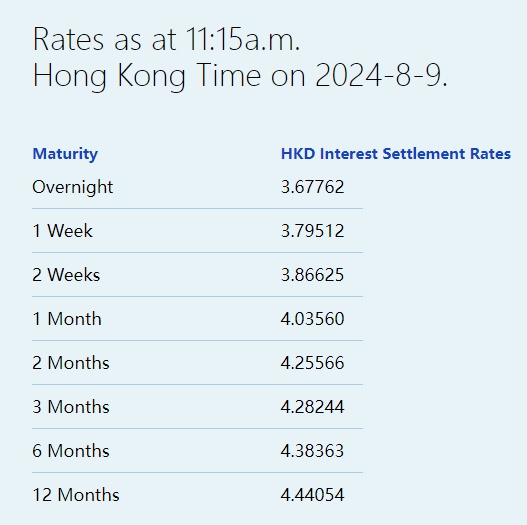智通财经APP获悉,8月9日,港元拆息持续走低,隔夜息低见3.67762%,见逾两个月最低,与楼按相关的一个月拆息亦连跌十天,报4.0356%,续创4月25日以来新低。