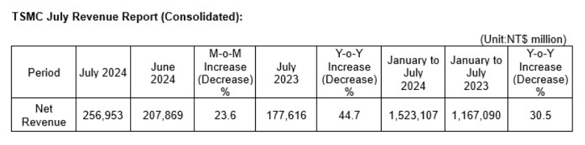 智通财经APP获悉,台积电(TSM.US)公布的数据显示,该公司7月营收达2569.53亿元新台币(约合79亿美元),同比增长44.7%、环比增长23.6%。分析师预计,台积电第三季度营收将同比增长37%至7474亿元新台币,7月营收数据表明,该公司第三季度营收可能会超出分析师预期。
