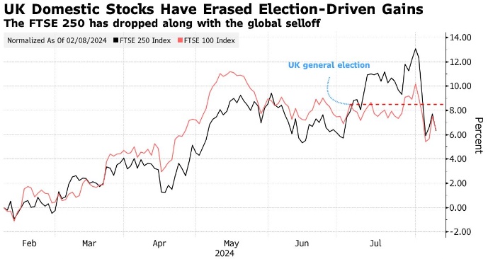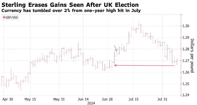 英国工党选举获胜后,英镑开启了上升之路。但现在,随着压力的增加,外汇交易员正在寻找保持乐观的理由。在本月初英国央行进行自2020年以来首次降息后,投资者对英镑已经转向谨慎态度,但他们没有预见到疲弱的美国数据和日本市场的动荡给英镑带来冲击。而且在英国,反移民骚乱和加税前景冲淡了大选后的乐观情绪,也加剧了英镑从一年高点的下跌。目前,英镑兑美元从一年高点下跌超过2%,至1.27附近。