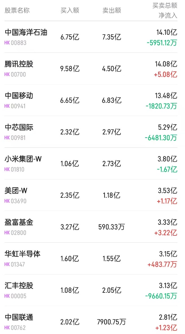 此外,小米集团-W(01810)、中海油(00883)分别获净买入6391万、2676万港元。而汇丰控股(00005)遭净卖出9660万港元。