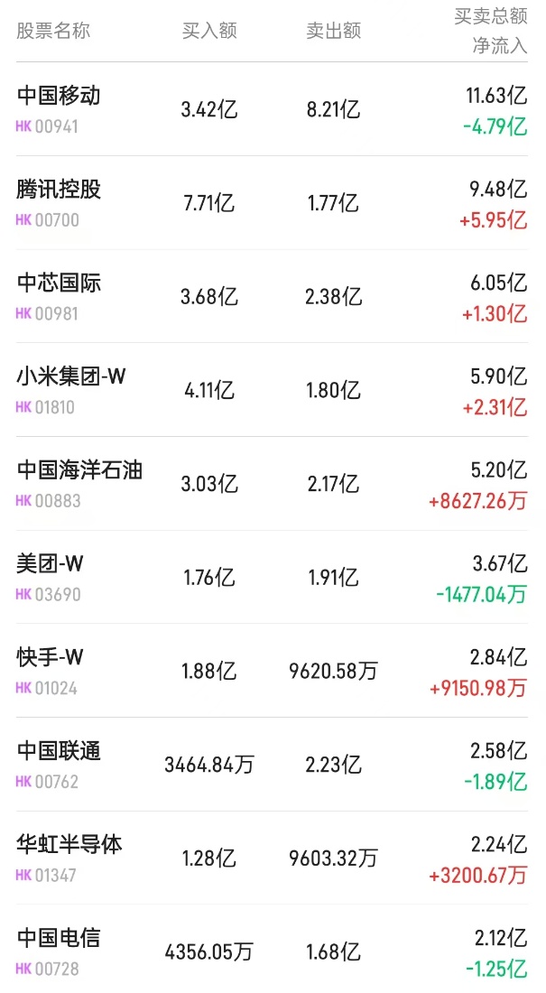 北水净买入最多的个股是腾讯(00700)、盈富基金(02800)、美团-W(03690)。北水净卖出最多的个股是中国移动(00941)、中国电信(00728)、汇丰控股(00005)。