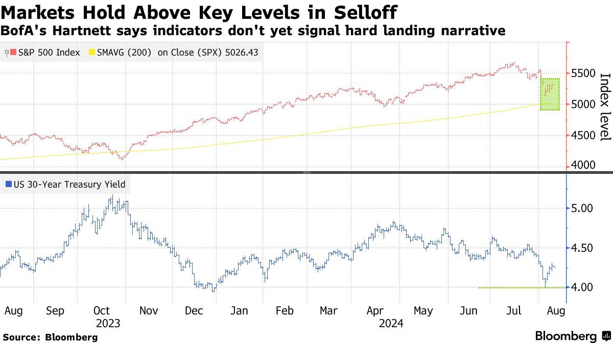 智通财经APP获悉,美国银行策略师Michael Hartnett表示,全球金融市场的动荡尚未达到足以让人担心经济硬着陆的程度。数据显示,尽管标普500指数目前较7月中旬的历史高点下跌了约6%,但该指数仍保持在约5050点的200日移动均线上方,而美国30年期国债收益率并未跌破4%。
