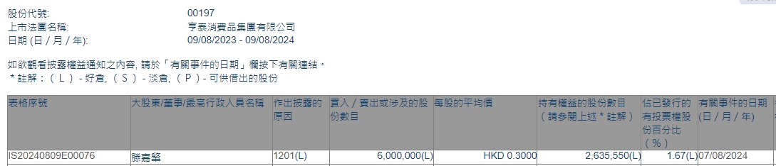 智通财经APP获悉,香港联交所最新资料显示,8月7日,滕嘉肇减持亨泰(00197)600万股,每股作价0.3港元,总金额为180万港元。减持后最新持股数目为263.55万股,最新持股比例为1.67%。