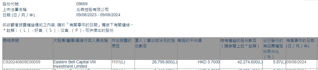 智通财经APP获悉,香港联交所最新资料显示,8月9日,Eastern Bell Capital VIII Investment Limited增持北森控股(09669)2879.96万股,每股作价3.7港元,总金额约为1.07亿港元。增持后最新持股数目为4227.46万股,最新持股比例为5.87%。