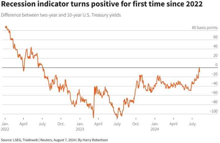 降息押注令短期美债收益率大跌,备受关注的追踪10年期和2年期美债收益率差值的曲线于周一转为正值,为2022年7月以来首次。