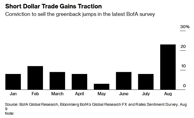 智通财经APP获悉,美国银行的一项调查显示,在市场准备迎接美联储降息之际,相信美元将走软的投资者比例在过去一个月几乎增加了两倍。在美银的月度情绪调查中,约23%的受访者表示,他们最确信的交易是做空美元,这是今年以来的最高比例,高于7月的8%。
