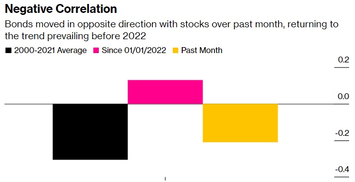 从另一个角度来看,这两种资产类别之间的传统反向关系——在本世纪头几十年基本上是如此——又回来了,至少目前是这样。
