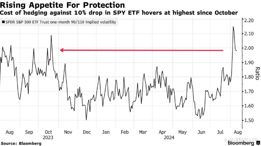 Bloomberg汇编的数据显示,防范SPDR标普500ETF(SPY)未来30天下跌10%的合约价格大约是去年10月以来的最高水平,是防范上涨10%的合约价格的两倍。