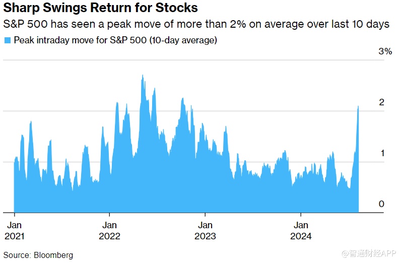 摩根大通跨资产策略主管Thomas Salopek表示,在股市中,对经济增长风险的担忧挥之不去,导致仓位大幅逆转。根据Bloomberg汇编的数据,标普500指数在过去10个交易日的平均波动峰值达到2%,这是自2022年11月以来的最高水平。