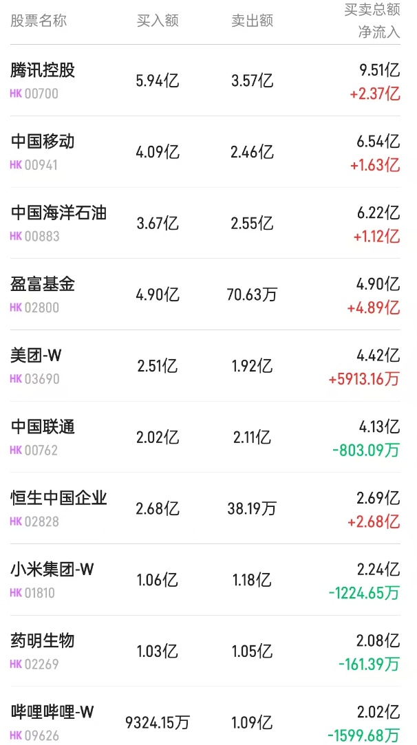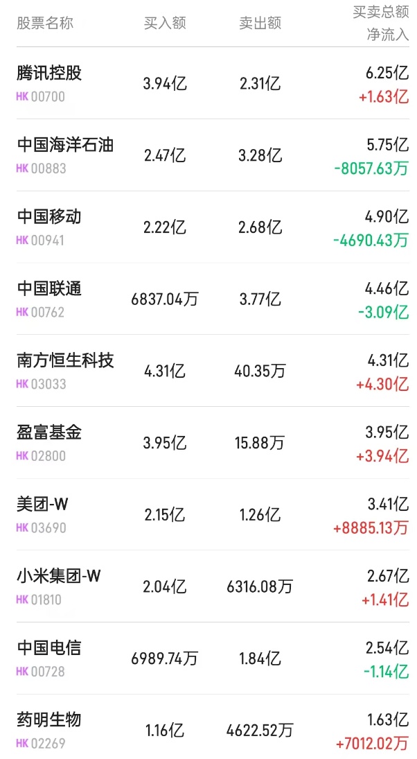北水净买入最多的个股是盈富基金(02800)、南方恒生科技(03033)、腾讯(00700)。北水净卖出最多的个股是中国联通(00762)、中国电信(00728)。