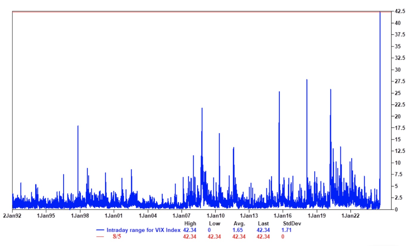 高盛回顾了波动率指数自1990年以来的历史,指出当VIX波动在10-20点之间时,通常会伴随着标普500指数(SPX.US)5-10%的盘中波动。然而,即便是在8月5日这样一个历史性的日子里,标普500指数的交易区间也未突破3%,这进一步凸显了市场的异常。