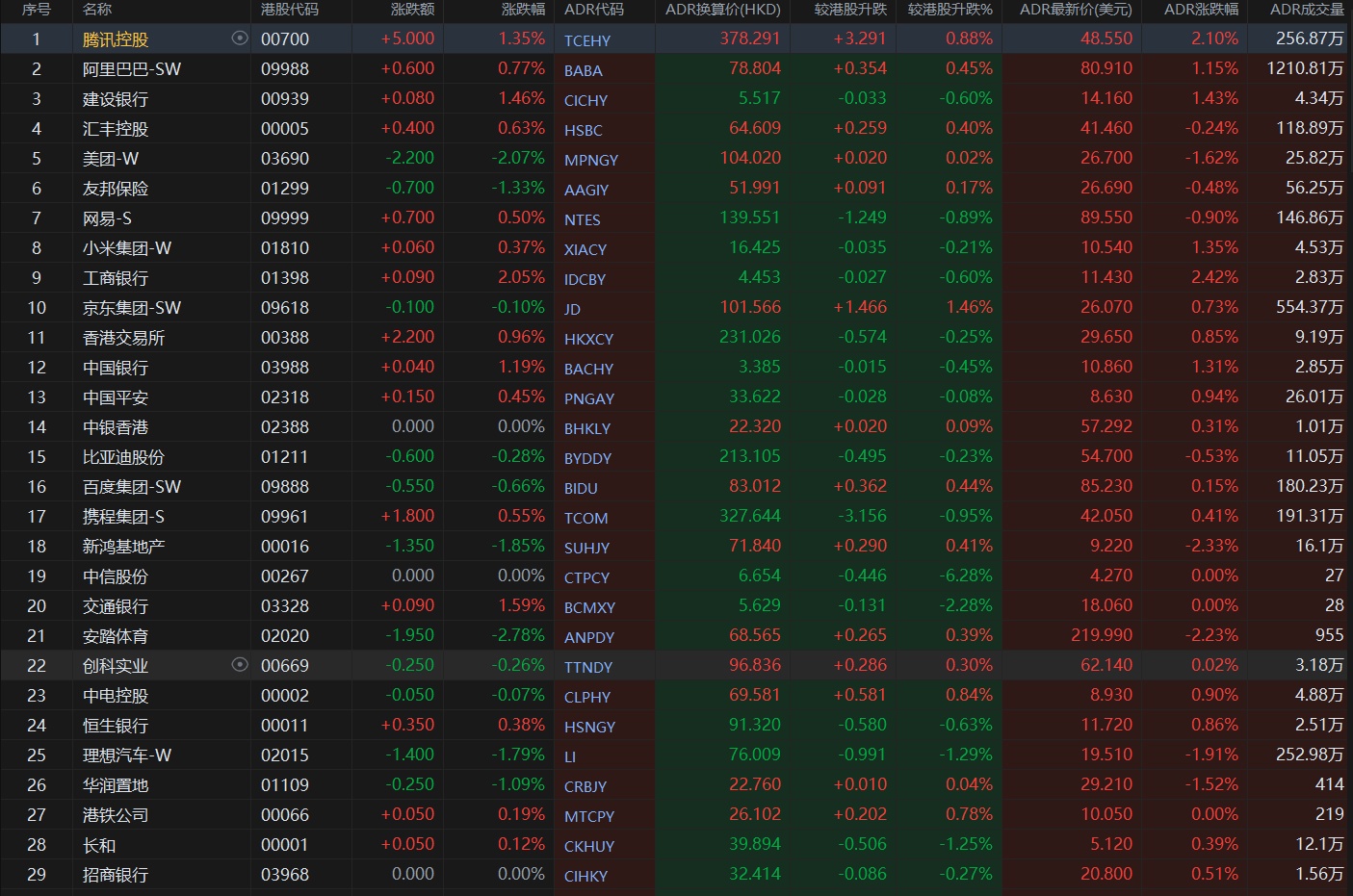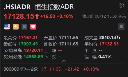 智通财经APP获悉,周一美股三大指数涨跌不一,恒生指数ADR上涨,按比例计算,收报17128.15点,较香港收市上涨16.50点或0.10%。