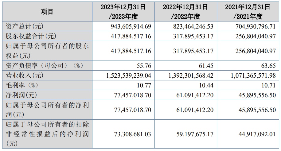 财务方面,于2021年度、2022年度及2023年度,公司实现营业收入分别约为10.71亿元、13.92亿元、15.24亿元。公司净利润分别约为4589.56万元、6109.14万元、7745.70万元人民币。