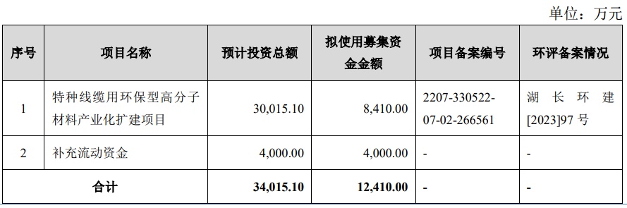 本次募集资金投资项目“特种线缆用环保型高分子材料产业化扩建项目”拟新增4套生产线,其中500kV及以下过氧化物可交联电缆料生产线设备1套,35kV及以下过氧化物可交联电缆料生产线设备1套,新能源特种材料生产线设备2套。项目达成后,每年将新增500kV及以下过氧化物可交联电缆料20,000吨,35kV及以下过氧化物可交联电缆料12,000吨,新能源特种材料38,000吨的产能。