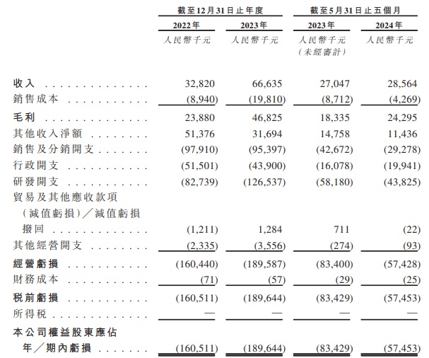 财务方面,于2022年、2023年、以及2023年1-5月、2024年1-5月,华昊中天的收入分别为3282.0万元、6663.5万元及2704.7万元、2856.4万元人民币。同期,该公司实现毛利分别为2388.0万元、4682.5万元及1833.5万元、2429.5万元人民币。
