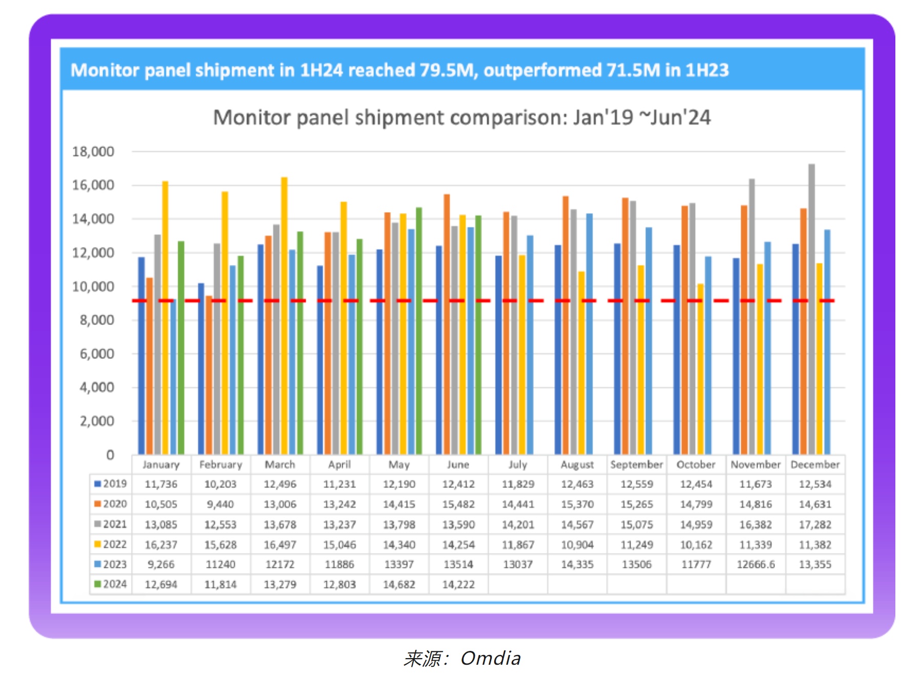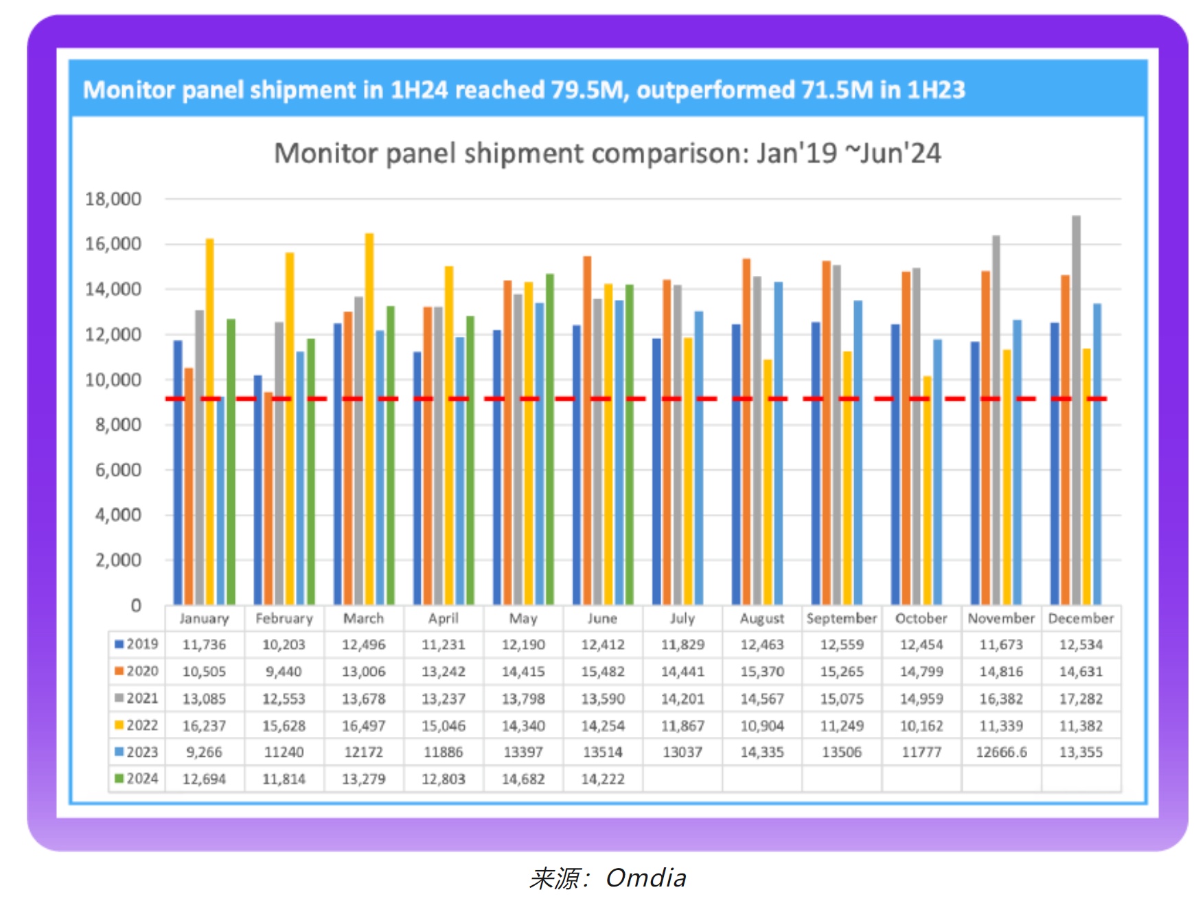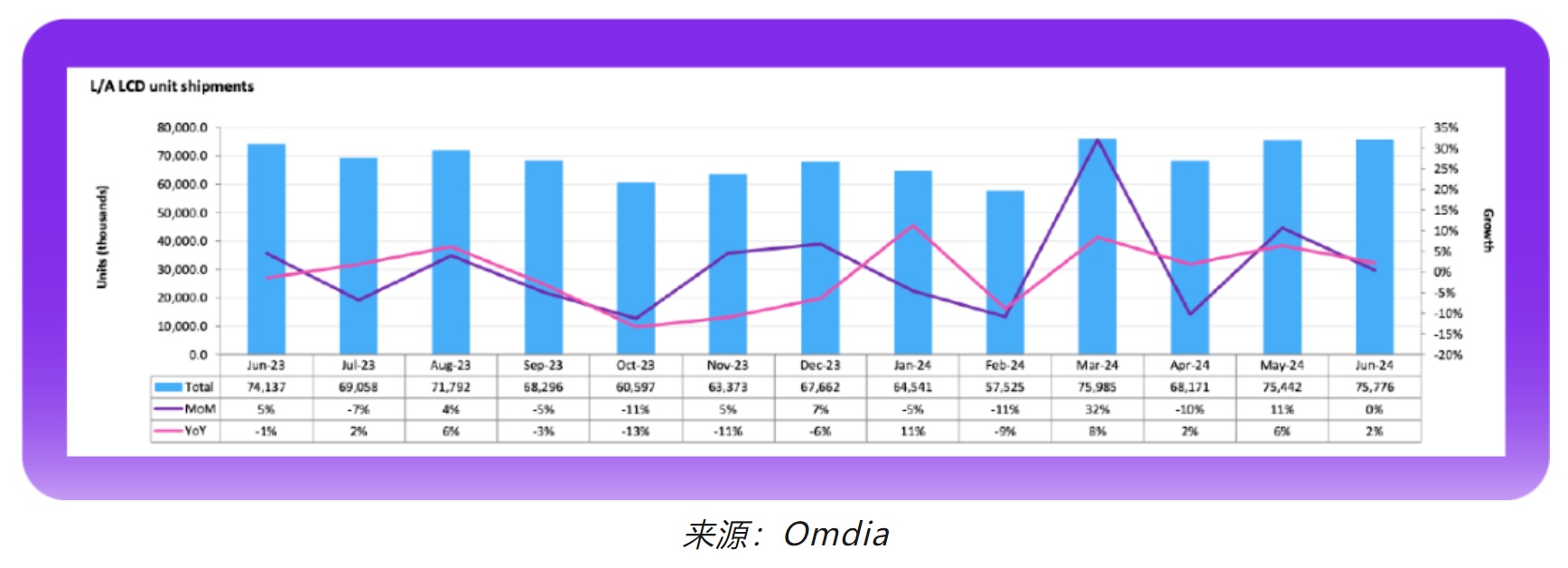 Omdia最新月度出货报告 《大尺寸面板市场追踪报告—2024年6月数据》, 大尺寸面板出货6月出货略超5月,达到7578万片,相较2023年6月的7414万片出货成长2%。大尺寸面板出货在6月尽管仍然处在面板厂控产策略之下,出货水平仍然维持在较好的水平。