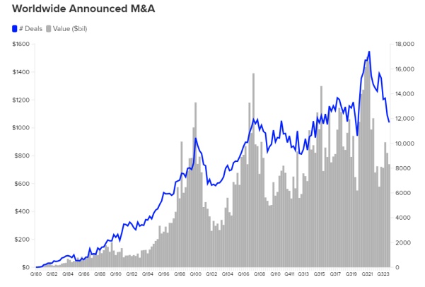 以巨额交易为中心的复苏,部分原因是美国股市创下历史新高。今年到目前为止,22%的并购交易全部或部分使用了股票,这在利率上升、股票市场活跃的情况下是意料之中的。因此,一些最大的交易都是纸上谈兵,如Discovery和Capital One的全股票合并。