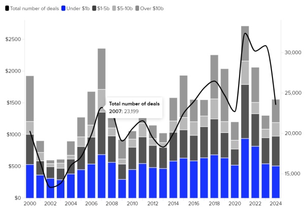 此外,悲观主义者可能会指出,迄今为止并购反弹中存在令人担忧的不平衡现象。虽然巨型并购交易有望领跑并购市场,而且确实如此,但几乎没有迹象表明中小型并购市场正在同步复苏。与2023年上半年相比,5亿美元及以下的交易减少了11%,降至3600亿美元,跌至十多年来从未见过的水平。与此同时,中型市场的交易数量下降了近四分之一,如下图所示: