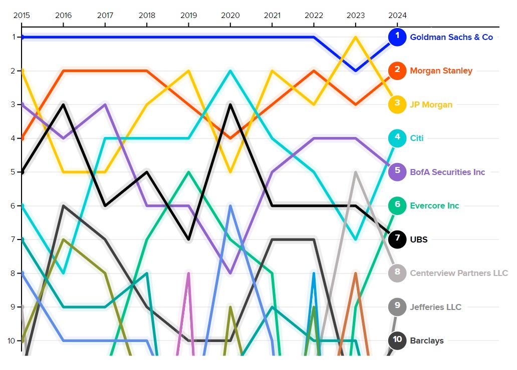 除了高盛集团(Goldman Sachs)一家独大之外,全球十大并购顾问公司之间的格局并不明显,近年来精品公司的出现进一步扰乱了竞争格局。