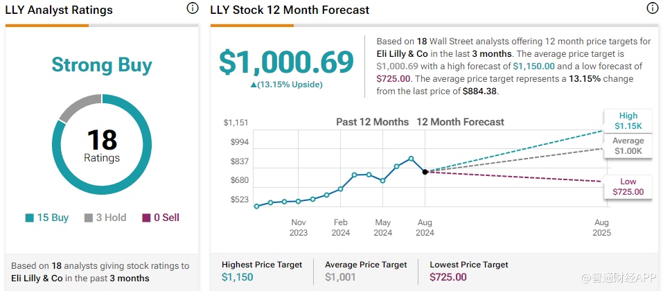 总体而言,华尔街分析师予礼来“强力买入”评级,平均目标价为1000.69美元,较当前水平高出13%。