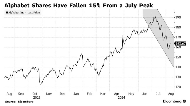 Alphabet的股价已经从7月中旬的高点下跌了15%。由于对美国经济增长放缓和估值过高的担忧,该公司与其他大型科技股一样面临压力,而投资者越来越担心,在人工智能方面的巨额支出相对较少。Alphabet股价下跌,此前该公司第二季度资本支出高于预期,原因是该公司努力在人工智能领域超越竞争对手。