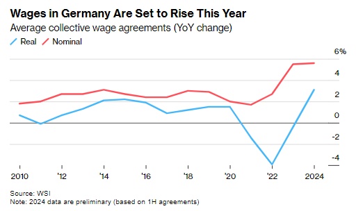 与德国工会联合会有联系的汉斯·伯克勒基金会的研究员Thorsten Schulten表示,今年实际工资的强劲增长“将明显弥补2021年和2022年实际工资的大幅下降,以及2023年的小幅下降”。