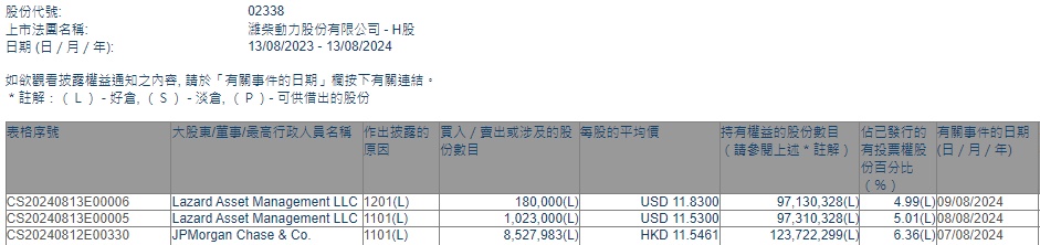 智通财经APP获悉,香港联交所最新资料显示,8月7日,摩根大通增持潍柴动力(02338)852.7983万股,每股作价11.5461港元,总金额约为9846.49万港元。增持后最新持股数目约为1.24亿股,持股比例为6.36%。