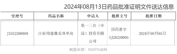 智通财经APP获悉,8月13日,中国国家药品监督管理局(NMPA)官网刚刚公示显示,阿斯利康(AZN.US)(AstraZeneca)和第一三共(Daiichi Sankyo)联合开发的注射用德曲妥珠单抗新适应症上市申请已获得批准。根据中国国家药品监督管理局药品审评中心(CDE)优先审评公示,该药本次获批的适应症为:用于治疗既往接受过两种或两种以上治疗方案的局部晚期或转移性HER2阳性成人胃或胃食管结合部腺癌患者。德曲妥珠单抗是一款独特设计靶向HER2的抗体偶联药物(ADC),此前已在中国获批乳腺癌适应症。