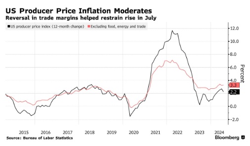 剔除波动较大的食品和能源类别后,7月PPI与上月持平,为四个月来最温和的读数。核心PPI同比上涨2.4%。