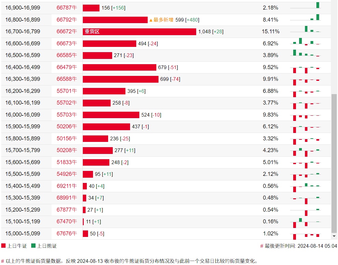 牛证街货重货区在16700-16799区间,该区间最新牛证数量为1048张,较上一交易日增加28张;最多新增在16800-16899区间,该区间最新牛证数量为599张,较上一交易日增加480张。