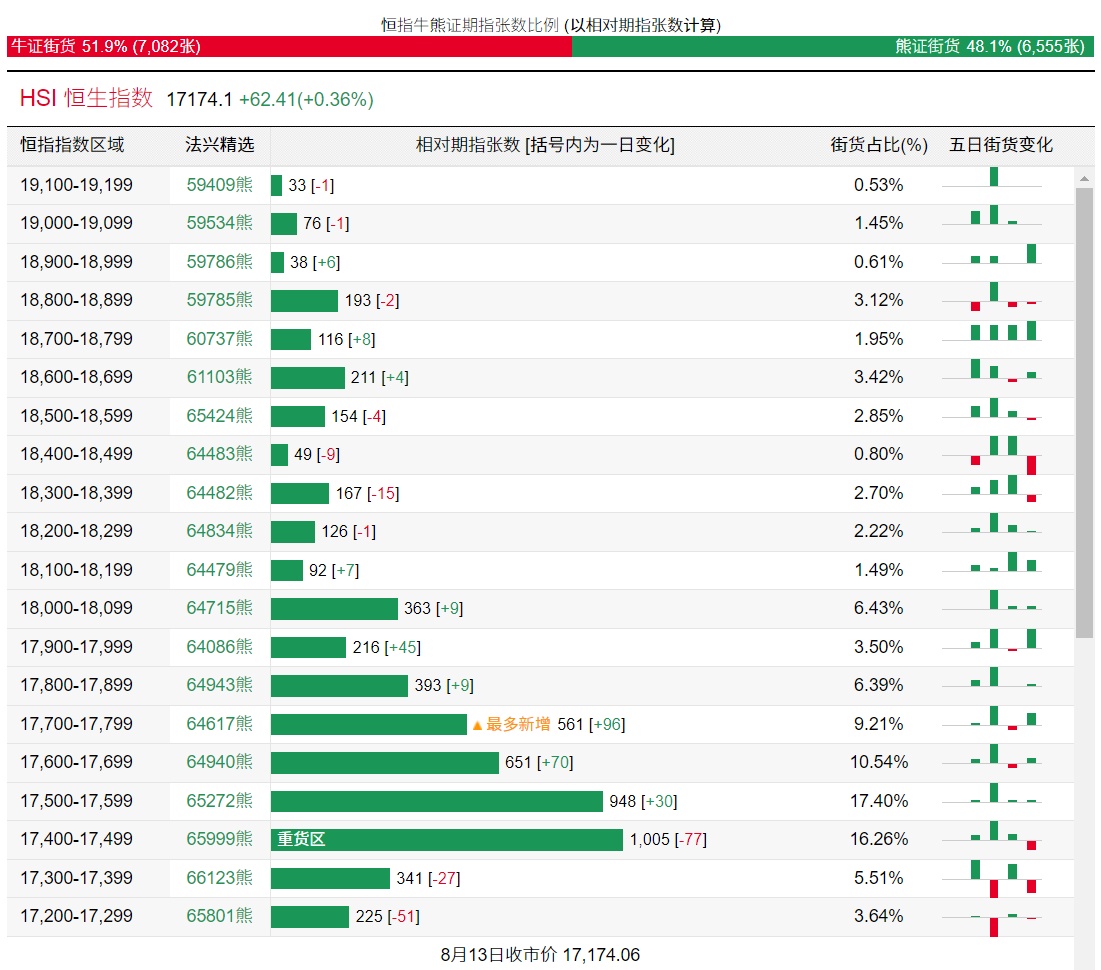 智通财经APP获悉,截至8月14日,恒指最新的牛熊街货比例为52:48。
