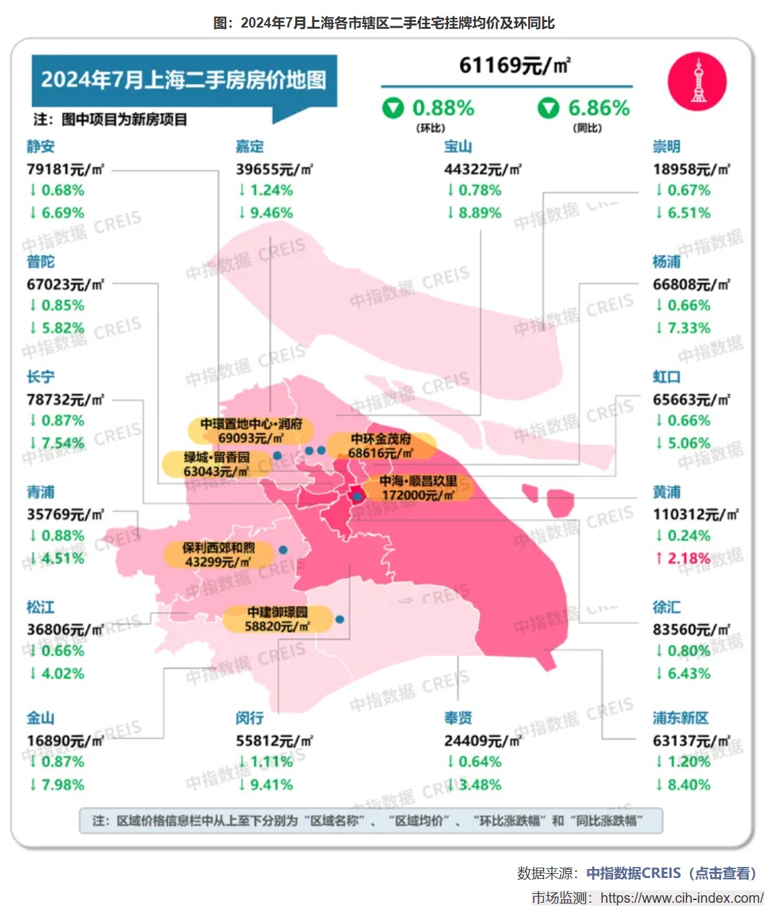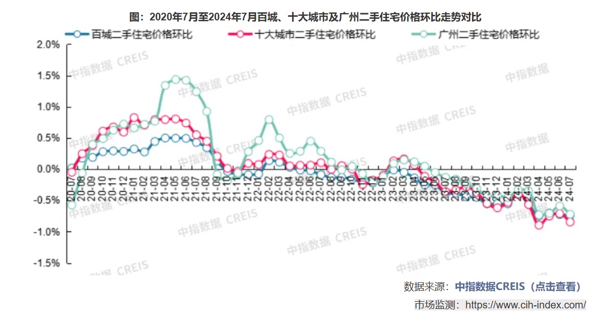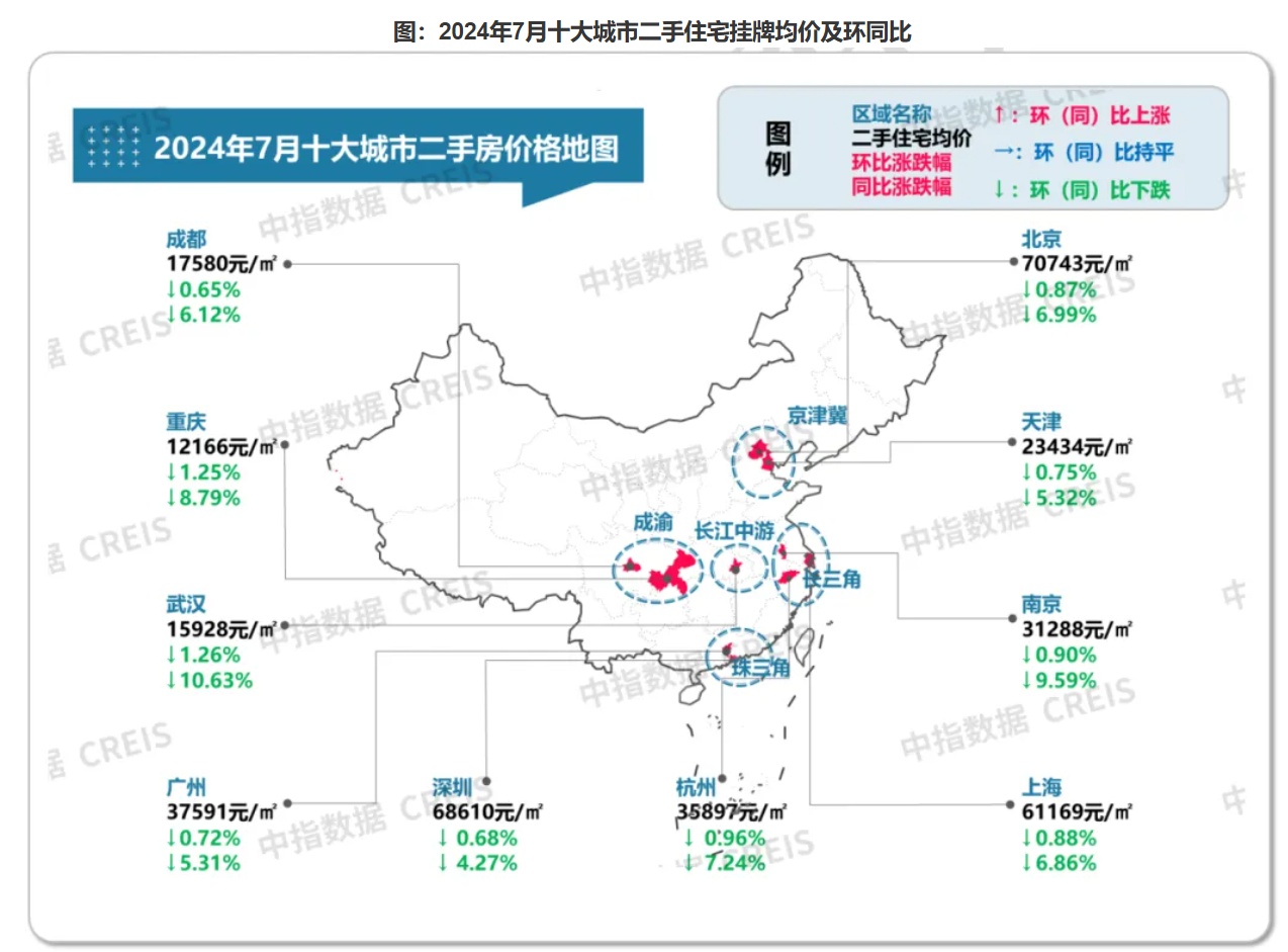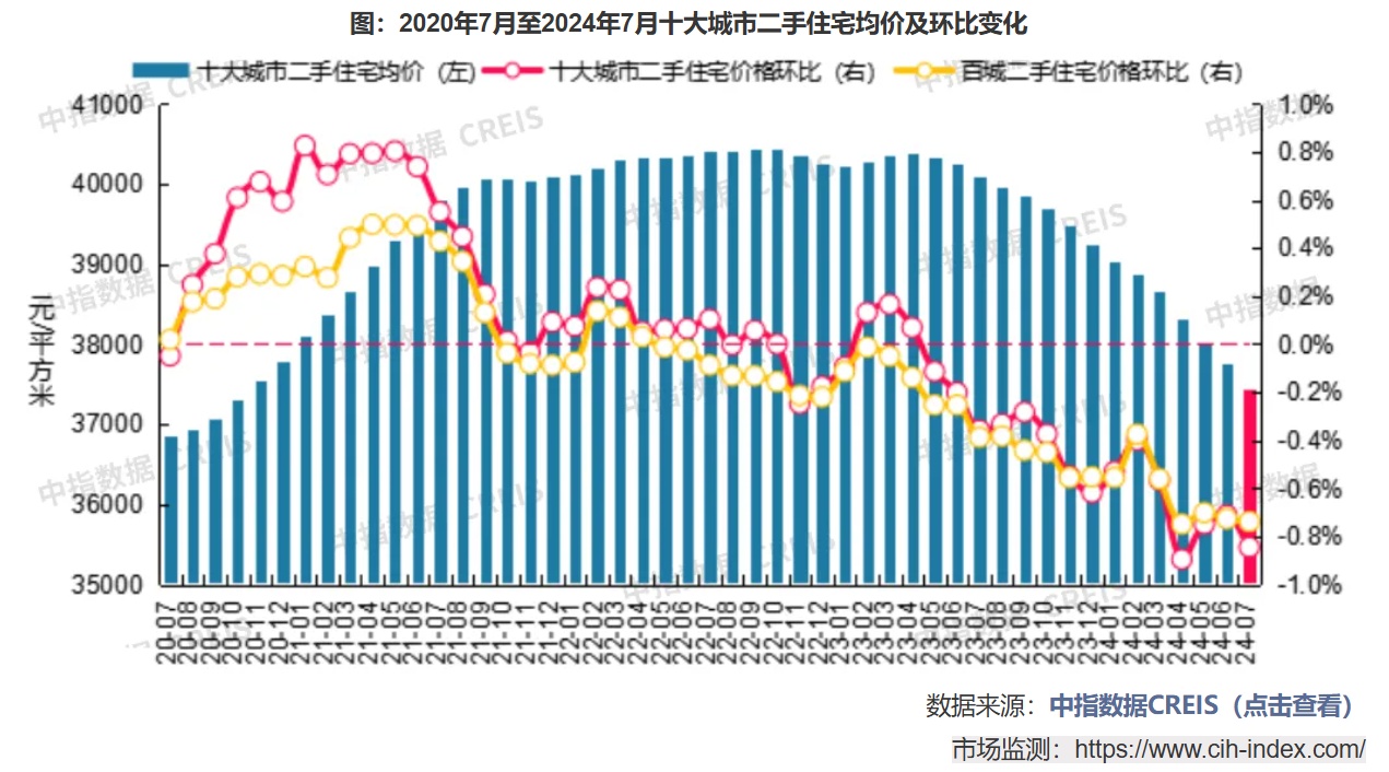 根据中国房地产指数系统百城价格指数,2024年7月,百城二手住宅均价环比下跌0.74%,跌幅较6月扩大0.01个百分点;同比下跌6.58%,跌幅较6月扩大0.33个百分点。7月,十大城市二手住宅均价环比下跌0.84%,跌幅较6月扩大0.13个百分点;同比下跌6.64%,跌幅较6月扩大0.46个百分点。