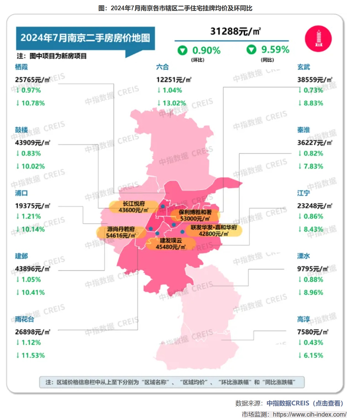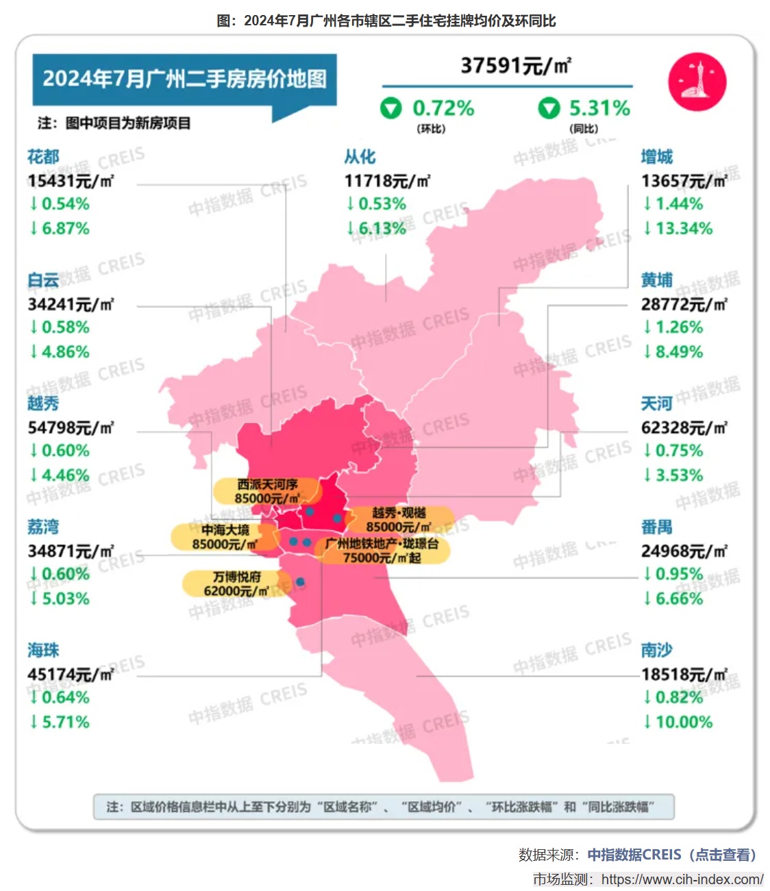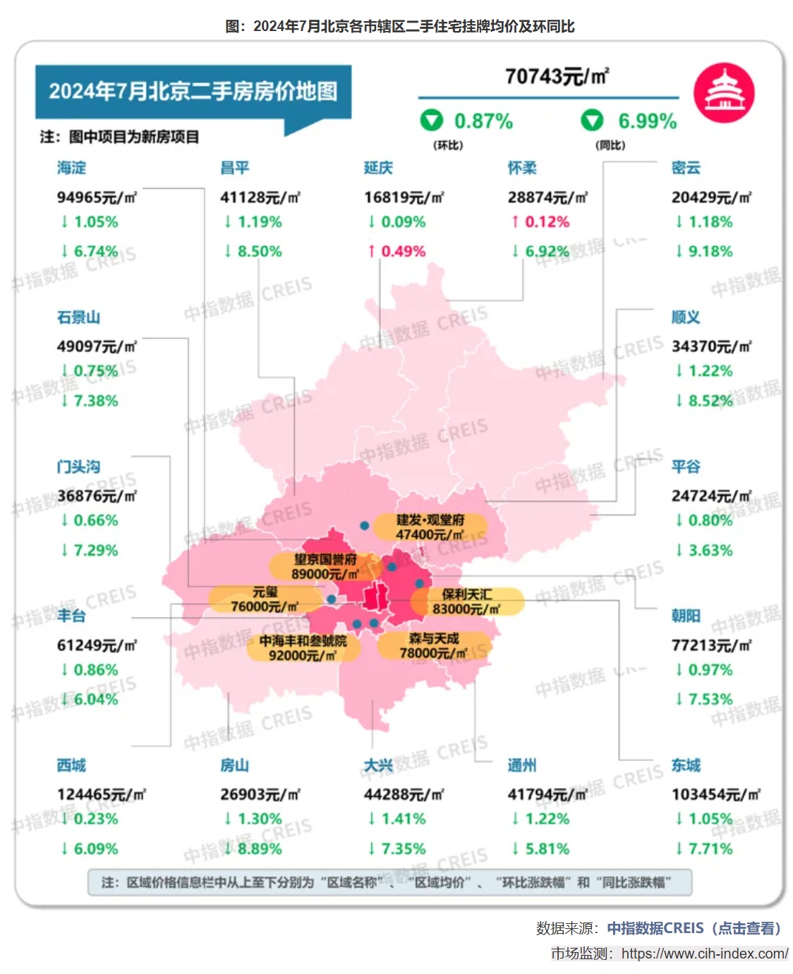 根据中国房地产指数系统百城价格指数,2024年7月,百城二手住宅均价环比下跌0.74%,跌幅较6月扩大0.01个百分点;同比下跌6.58%,跌幅较6月扩大0.33个百分点。7月,十大城市二手住宅均价环比下跌0.84%,跌幅较6月扩大0.13个百分点;同比下跌6.64%,跌幅较6月扩大0.46个百分点。