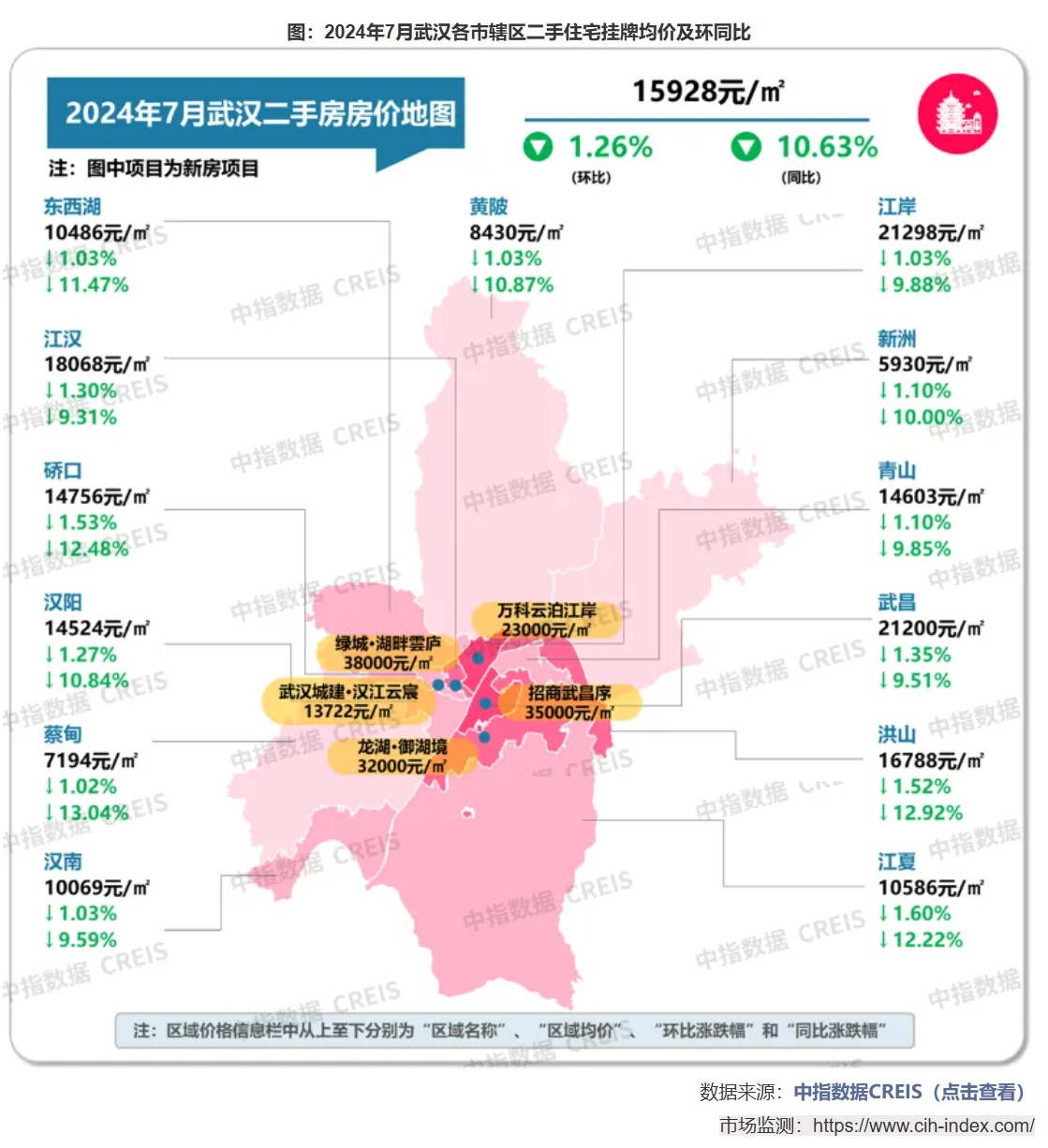 7月,武汉二手住宅价格环比跌幅继续扩大。二手房高挂牌量下导致买方观望情绪浓厚,成交节奏逐渐变慢,7月武汉二手住宅价格环比下跌1.26%,跌幅较6月扩大0.03个百分点。