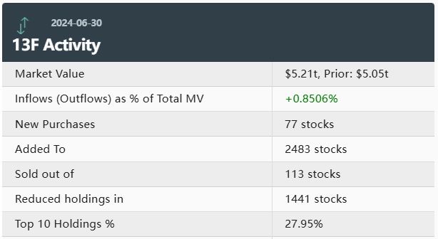 统计数据显示,先锋集团第二季度持仓总市值达5.21万亿美元,上一季度总市值为5.05万亿美元。先锋集团在第二季度的持仓组合中新增了77只个股,增持了2483只个股。同时,先锋集团减持了1441只个股,清仓了113只个股。其中,先锋集团的前十大持仓标的占总市值的27.95%。