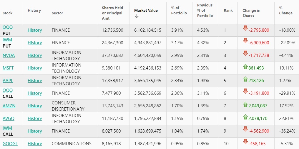具体来看,纳斯达克100指数ETF看跌期权(QQQ.US,PUT)位列花旗第一大持仓标的,持仓约1274万股,持仓市值约为61亿美元,占投资组合比例为3.91%,较上季度的持仓数量大幅减少18%。
