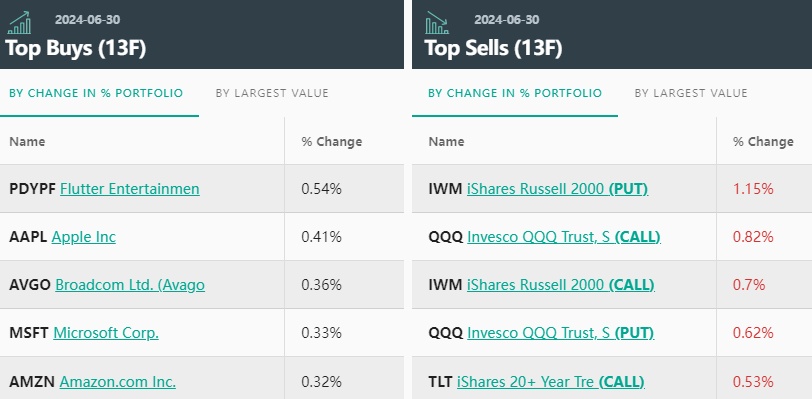 从持仓比例变化来看,前五大买入标的分别是:博彩业巨头Flutter Entertainment(PDYPF.US)、苹果、博通、微软和亚马逊。