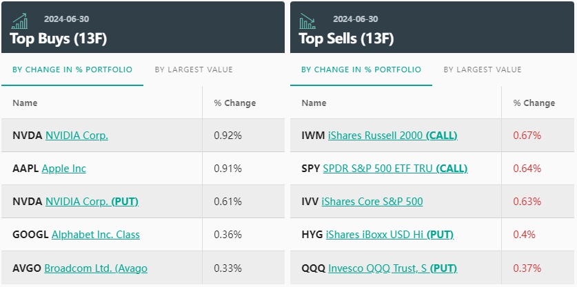 从持仓比例变化来看,前五大买入标的分别是:英伟达(NVDA.US)、苹果(AAPL.US)、英伟达看跌期权(NVDA.US,PUT)、谷歌(GOOGL.US)、博通(AVGO.US)。
