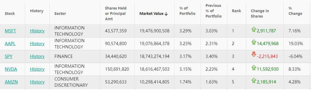 在前五大重仓标的中,微软(MSFT.US)位列第一,持仓约4357.73万股,持仓市值约194.77亿美元,占投资组合比例为3.29%,较上季度持仓数量增加了7.16%;