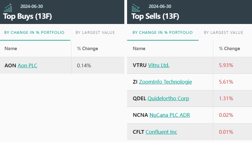 从持仓比例变化来看,凯雷第二季度最大规模买入标的为 Aon PLC(AON.US)。凯雷第二季度前五大卖出标的包括:Vitru Ltd(VTRU.US)、ZoomInfo Technologies(ZI.US)、Quidel Corporation(QDEL.US)、 NuCana PLC ADR(NCNA.US)以及Confluent Inc(CFLT .US)。其中,Vitru Ltd与Confluent 在第二季度被凯雷清仓,Vitru是一家专注于教育技术的公司,总部位于巴西。公司的主营业务是通过其在线教育平台提供高等教育课程,Confluent则是一家专注于实时数据流平台的软件公司。
