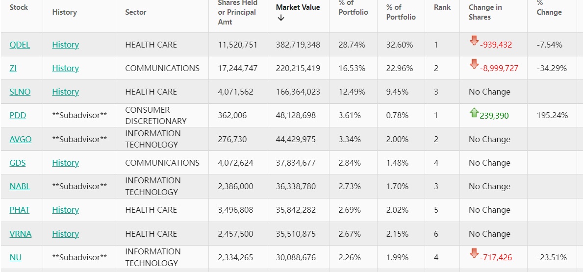 拼多多(PDD.US)位列第四,持仓约36万股,持仓市值约4813万美元,占投资组合比例为3.61%,较上季度持仓数量猛增195.24%。中国电商巨头拼多多在第二季度涨幅高达14%,7月以来的涨幅高达8%。千亿私募景林资产第二季度也大举加仓拼多多,买入拼多多超157万股,市值约2.09亿美元,在景林投资组合中的占比环比升5.15个百分点至18.24%,季末持有520.7万股,环比增长43.3%,拼多多也由此成为景林头号重仓股,超过了一季度曾位居第一的Meta。