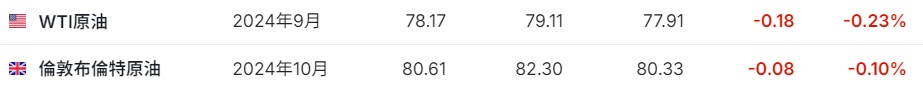 3. 截至发稿,WTI原油跌0.23%,报78.17美元/桶。布伦特原油跌0.10%,报80.61美元/桶。