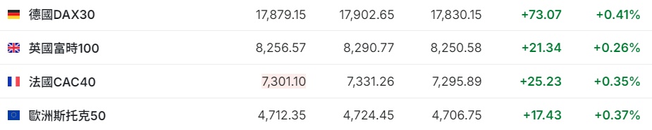 2. 截至发稿,德国DAX指数涨0.41%,英国富时100指数涨0.26%,法国CAC40指数涨0.35%,欧洲斯托克50指数涨0.37%。