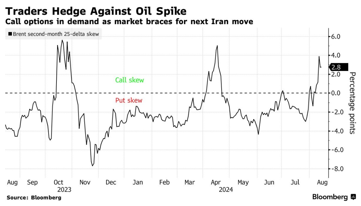 当时以及四月份伊朗袭击以色列时,看涨信号都大幅增加,因为交易商试图对冲该地区石油供应中断的风险,该地区石油供应约占全球石油供应的三分之一。