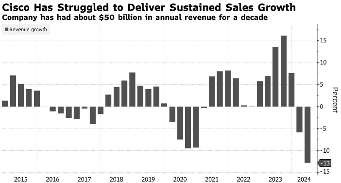 思科陷入了持续下滑的泥潭,销售额连续第三个季度下滑。自多年前大型企业开始转向云计算以来,该公司的核心网络业务(包括交换机和路由器)一直呈下降趋势。该公司加强了其软件和证券业务,以实现多元化,并带来更多的经常性订阅收入。