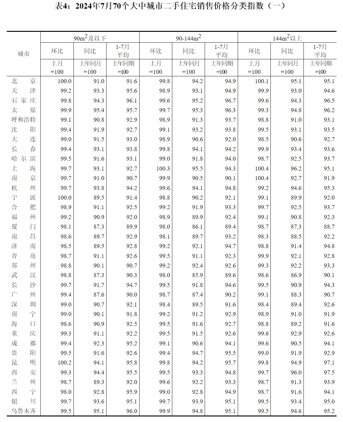 2024年7月份,商品住宅销售价格环比下降,同比降幅整体略有扩大,其中一线城市二手住宅销售价格同比降幅继续收窄。