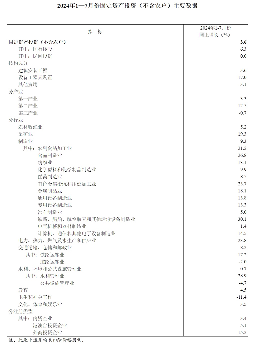 智通财经APP获悉,8月15日,国家统计局数据显示,2024年1-7月份,全国固定资产投资(不含农户)287611亿元,同比增长3.6%(按可比口径计算),其中,民间固定资产投资147139亿元,与去年同期持平。从环比看,7月份固定资产投资(不含农户)下降0.17%。