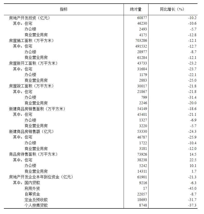 1—7月份,房地产开发企业房屋施工面积703286万平方米,同比下降12.1%。其中,住宅施工面积491532万平方米,下降12.7%。房屋新开工面积43733万平方米,下降23.2%。其中,住宅新开工面积31684万平方米,下降23.7%。房屋竣工面积30017万平方米,下降21.8%。其中,住宅竣工面积21867万平方米,下降21.8%。