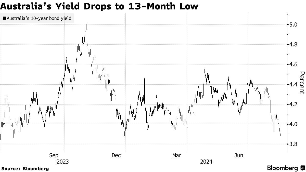 智通财经APP获悉,在外界越来越多地猜测澳洲联储即将开始降息的情况下,澳大利亚债券收益率跌至13个月以来低点。数据显示,基准十年期澳大利亚国债收益率下跌5个基点,至3.88%,为2023年7月以来的最低水平;对政策敏感的三年期澳大利亚国债收益率也下跌了5个基点。
